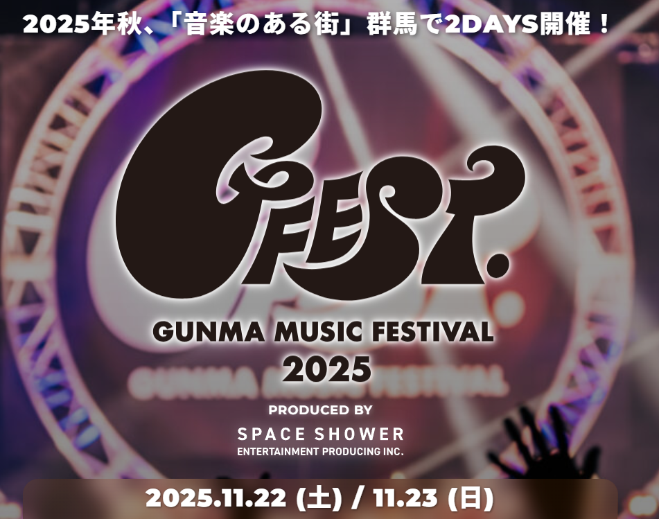 2025年秋、群馬で開催される2日間の音楽フェスティバル!「音楽のある街」をテーマに、GUNMA MUSIC FESTIVAL 2025がGメッセ群馬で**2025年11月22日(土)・23日(日)**に開催されます。SPACE SHOWERがプロデュースするビッグイベントです! 🎸🎤