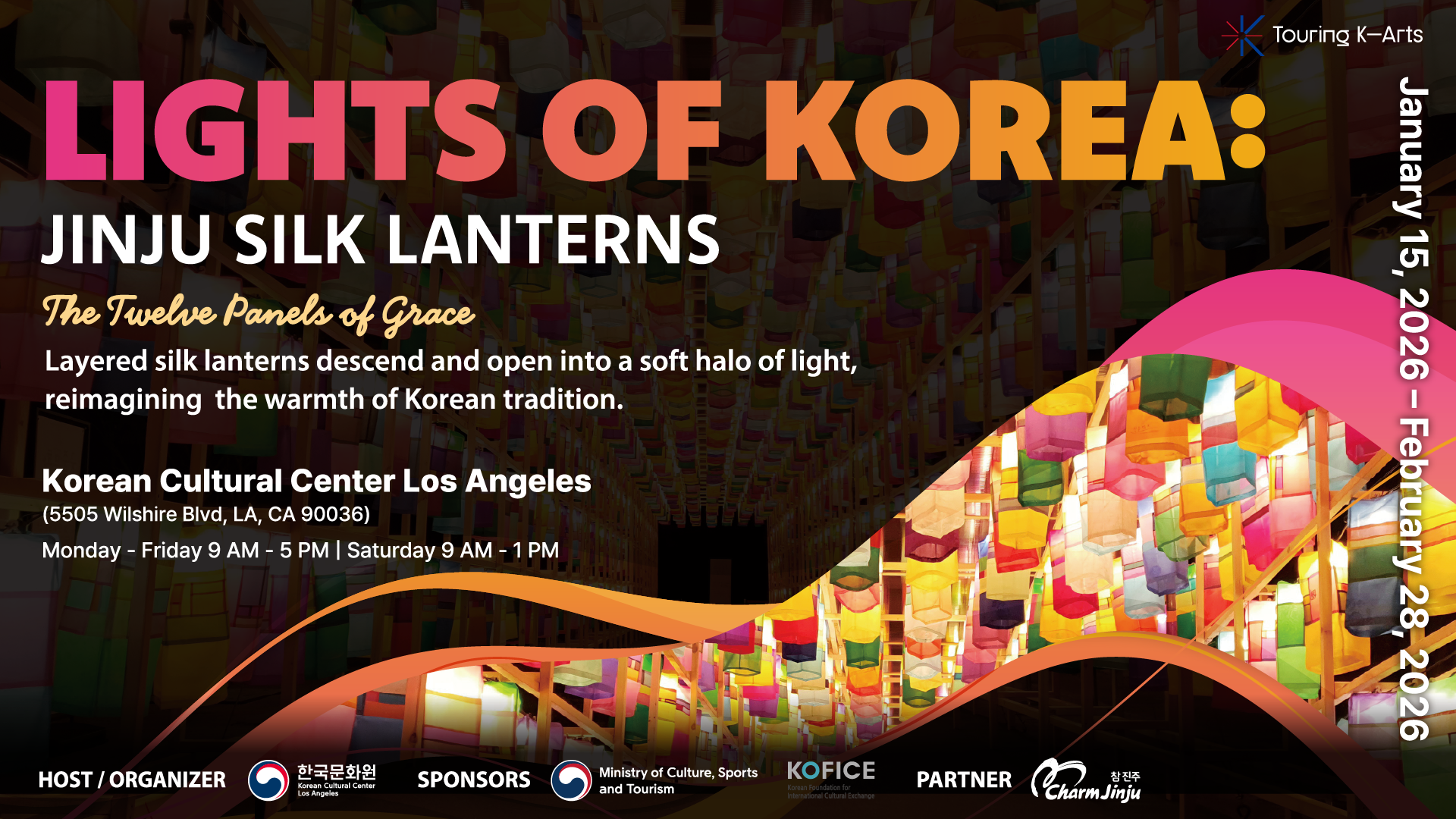 Experience the authentic beauty of Korea right here in LA. This exhibition, "The Twelve Panels of Grace," is an official project sponsored by the Ministry of Culture, Sports and Tourism (MCST) and Jinju City (famous for its world-class silk). 🏮