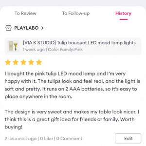 • Lazada SG x [VIA K STUDIO] Tulip bouquet LED mood lamp lights Reviewer Campaign (Lazada 리뷰 + SNS 포스팅 필수)